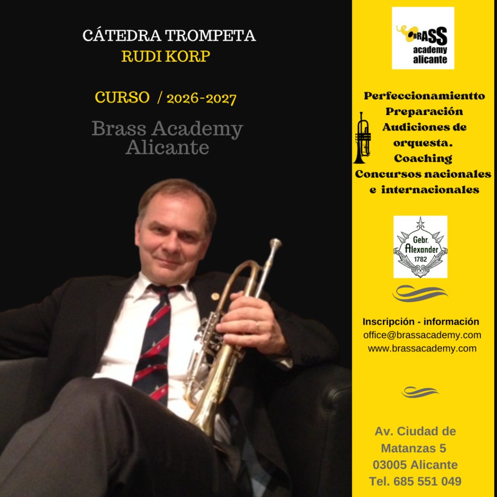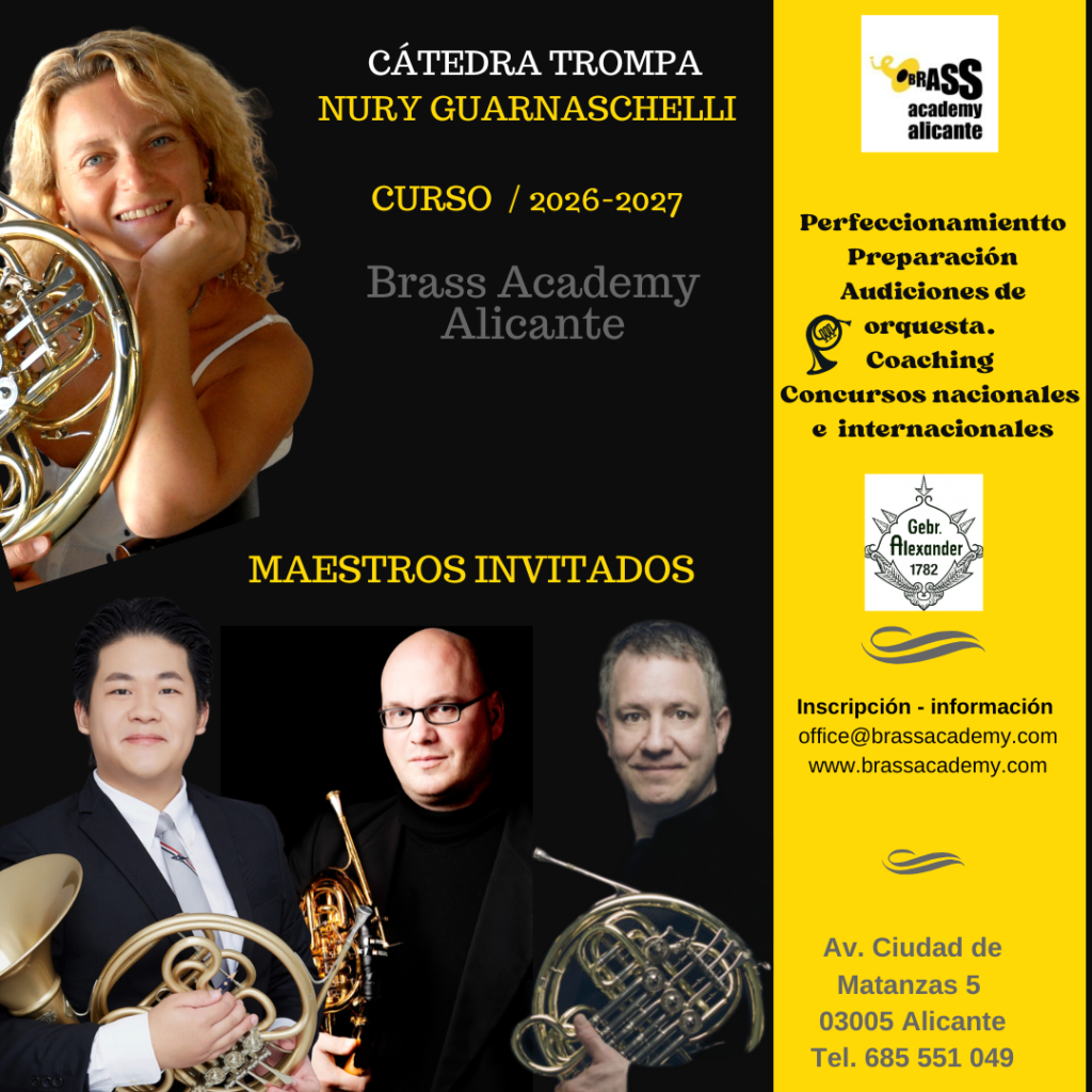 ¿Quieres llevar tu interpretación al siguiente nivel y aprender de los mejores del mundo de los metales? En Brass Academy Alicante te ofrecemos un curso único con maestros de renombre internacional como Rudi Korp, Nury Guarnaschelli, José García Gutiérrez, Alberto García Izquierdo, David Pérez, Antonio Vera Escribano, Daniel Perpiñán y Juan Sanjuan. Cada clase es una oportunidad para perfeccionar tu técnica, preparar audiciones y crecer musicalmente en un entorno profesional y motivador.
