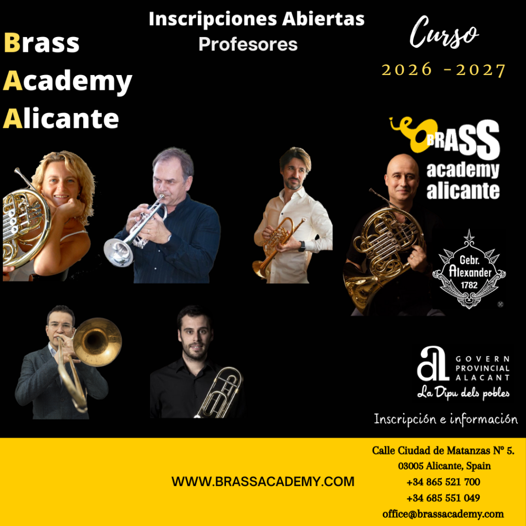 Gracias a esta positiva respuesta, el interés de muchos estudiantes de toda España, Latinoamérica y el resto de Europa, hoy la Brass Academy Alicante es una realidad que deseamos todos perdure en el tiempo y se desarrolle positivamente.